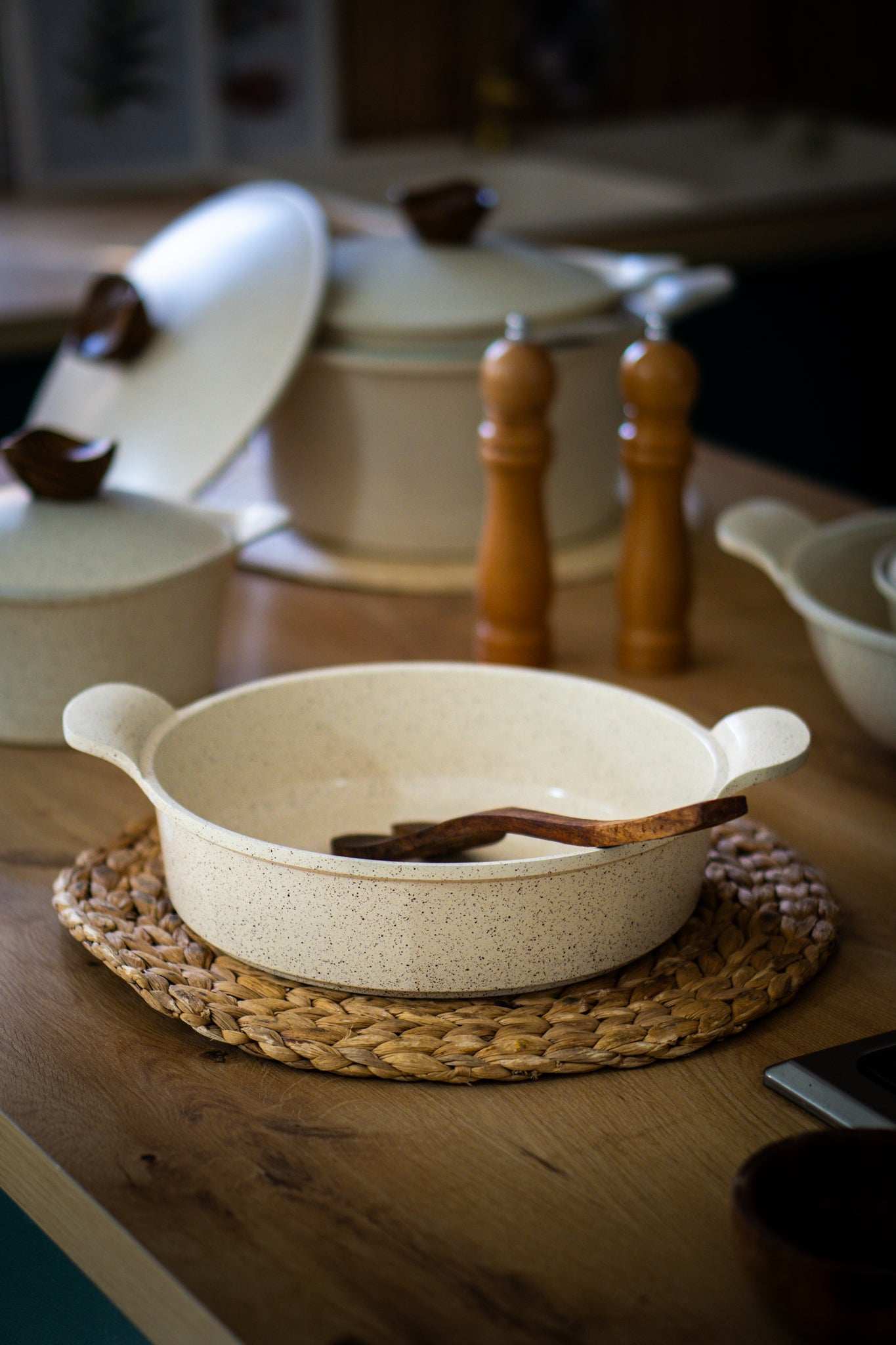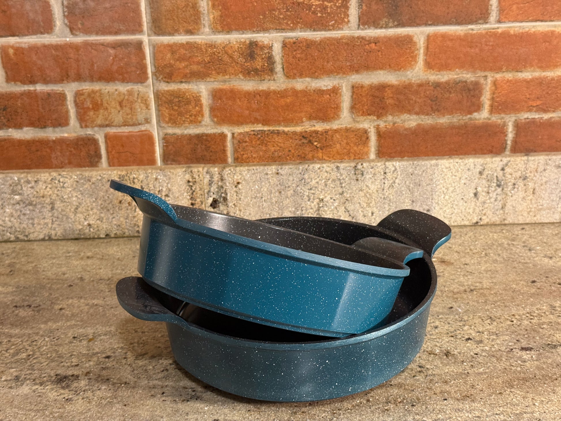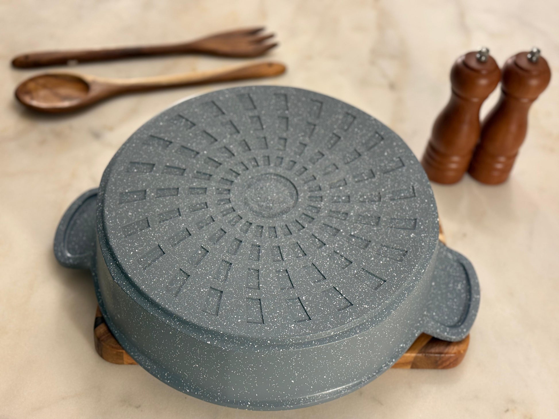 طقم صواني جرانيت غير لاصق، المصمم ليمنحك تجربة خبز وقلي مثالية. بفضل طبقته المقاومة للخدش وتوزيع الحرارة المتساوي، يمكنك الطهي بسهولة وبدون التصاق الطعام.